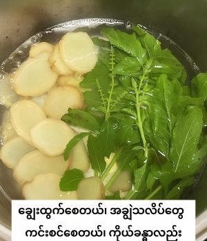​ရေကို ဆူအောင် တည်ပါ။ ပင်စိမ်းနဲ့ ဂျင်းတို့ကို ထည့်ပြီး ၁၀ မိနစ်ခန့် ဆက်တည်ပါ။ ပြီးရင် ရေကို စစ်ယူပါ။